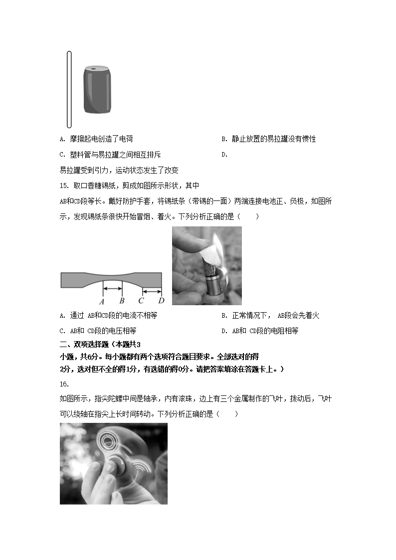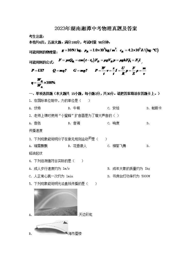 2023年湖南湘潭中考物理真题及答案(Word版)09-12