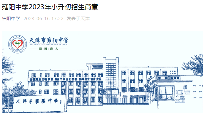 5、雍阳中学2023年小升初招生工作信息发布途径为“雍阳中学”微信公众号和“武清教育”“美丽武清”等官方媒体。其他途径发布的信息均与雍阳中学无关。