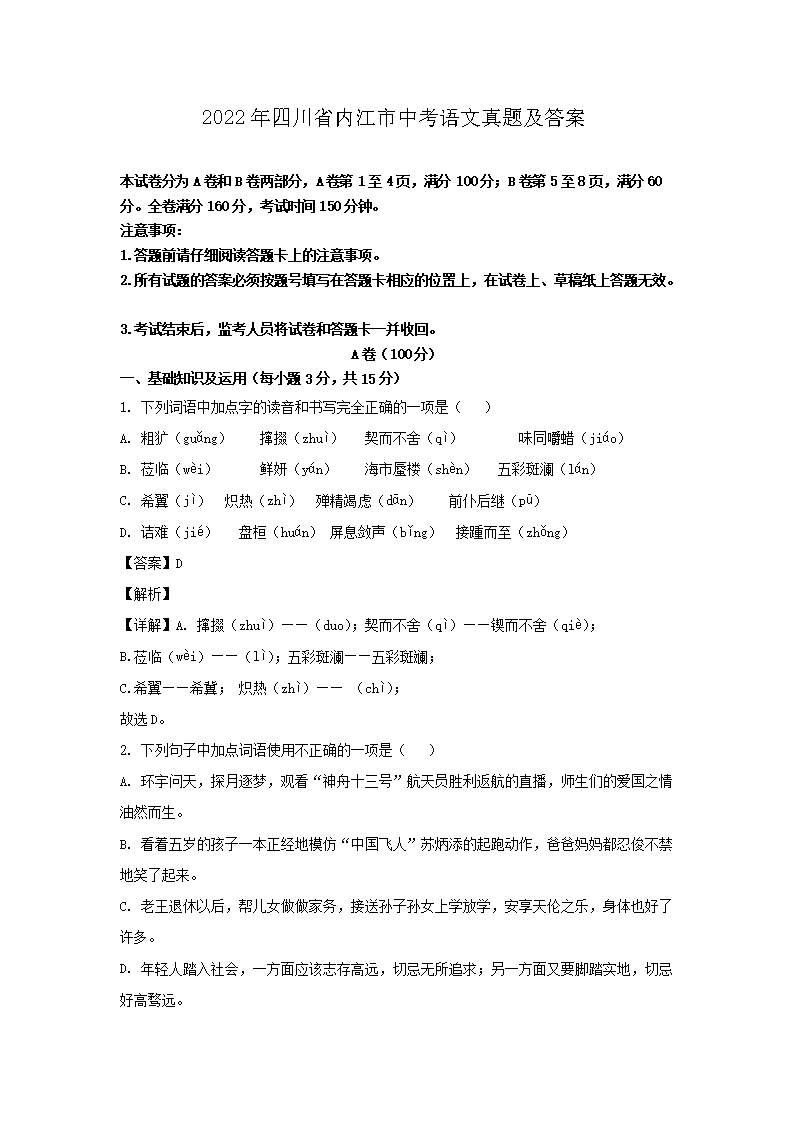 2022年四川省内江市中考语文真题及答案(Word版)05-31