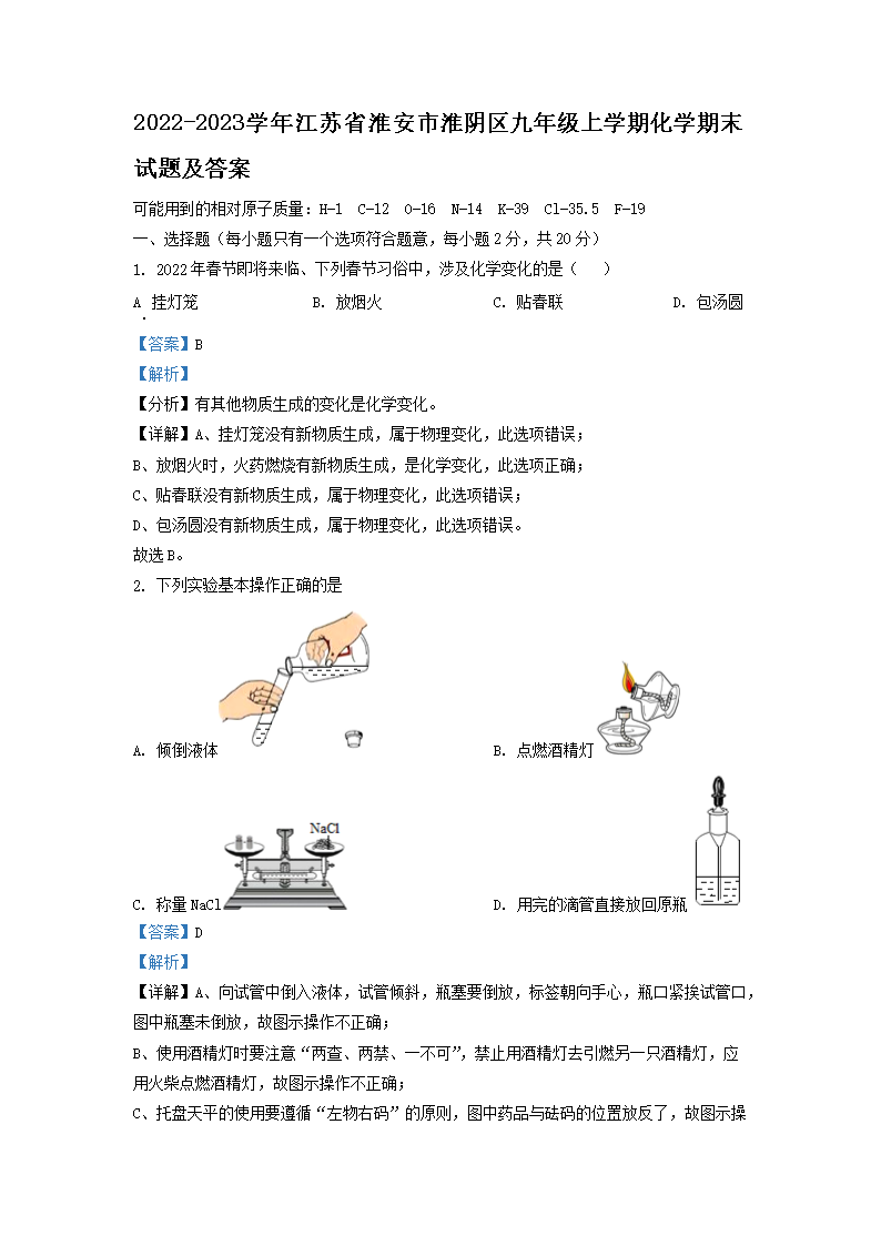2022-2023学年江苏省淮安市淮阴区九年级上学期化学期末试题及答案(Word版)09-20