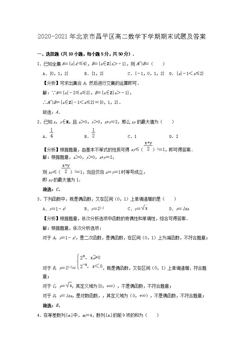 2020-2021年北京市昌平区高二数学下学期期末试题及答案(Word版)08-01
