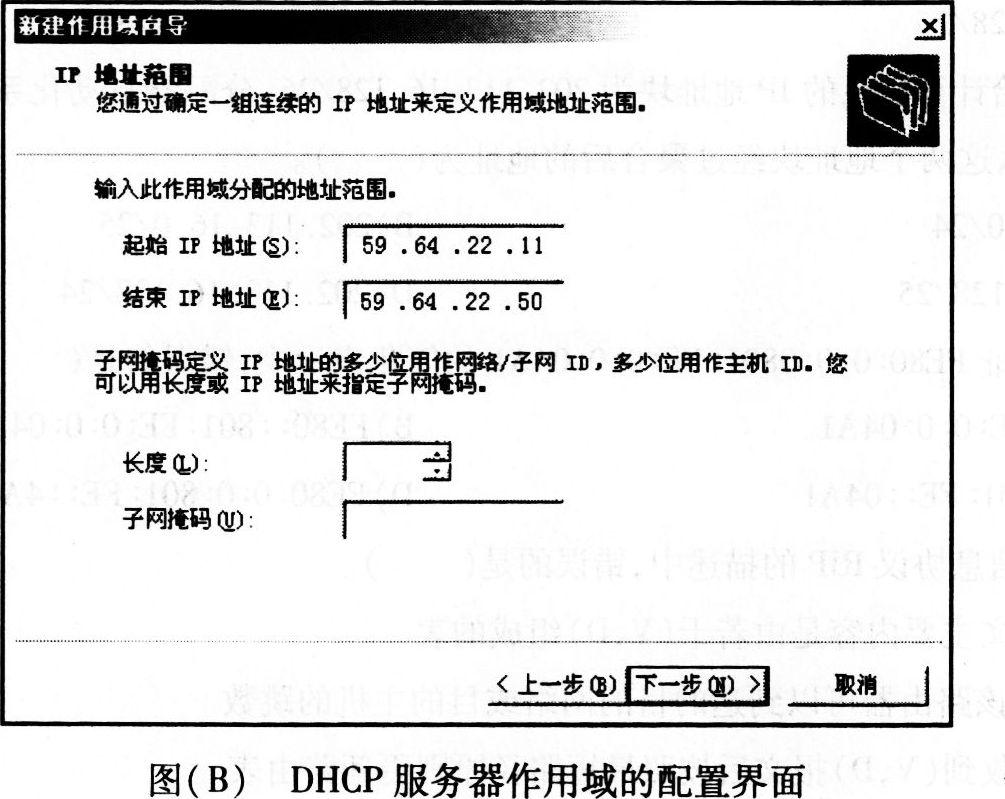 (2)如图(B)所示,DHCP服务器作用域的配置界面中,长度域输入的数值应是【12】。