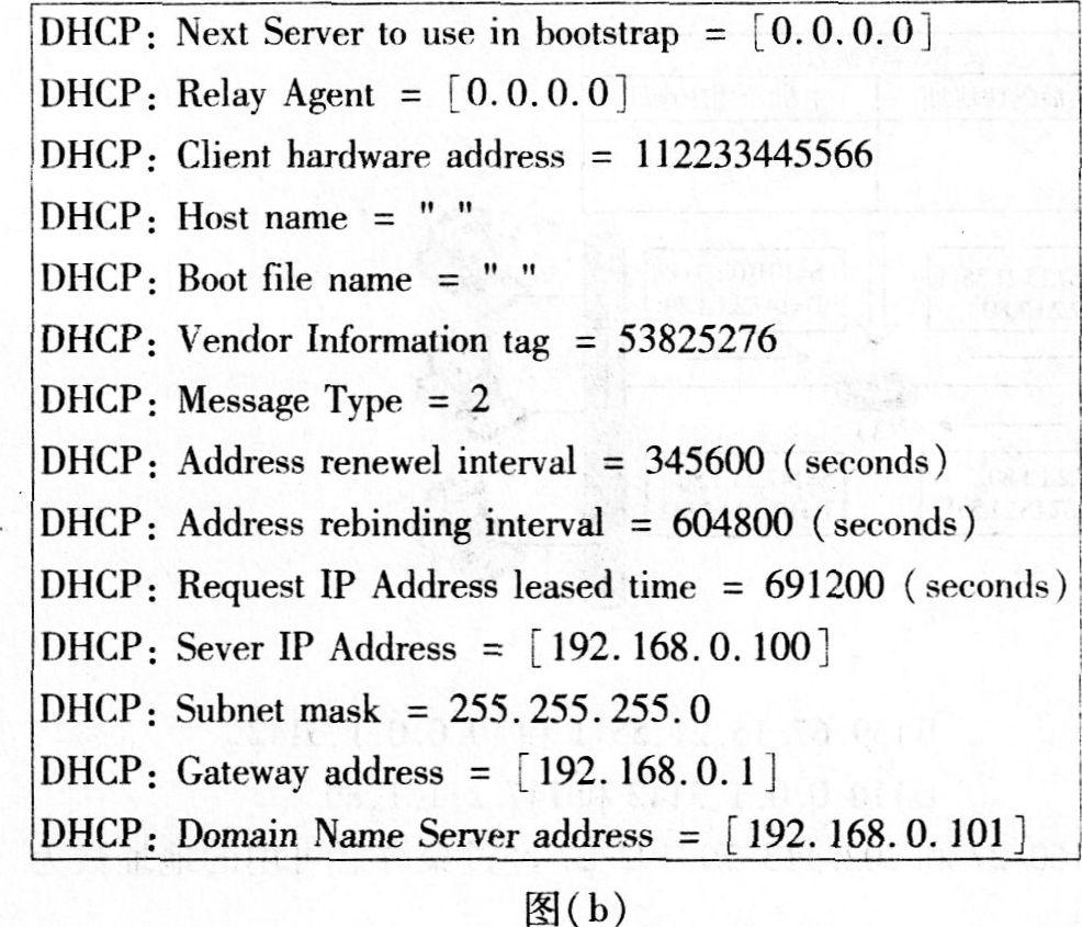 41、 某公司网络管理员使用DHCP服务器对公司内部主机的IP地址进行管理。在某DHCP客户机上执行"ipconfig/all"得到的部分信息如图(A.所示,在该客户机捕获的部分报文及相关分析如图(B.所示。请分析图中的信息,补充图(B.中空白处的内容。
