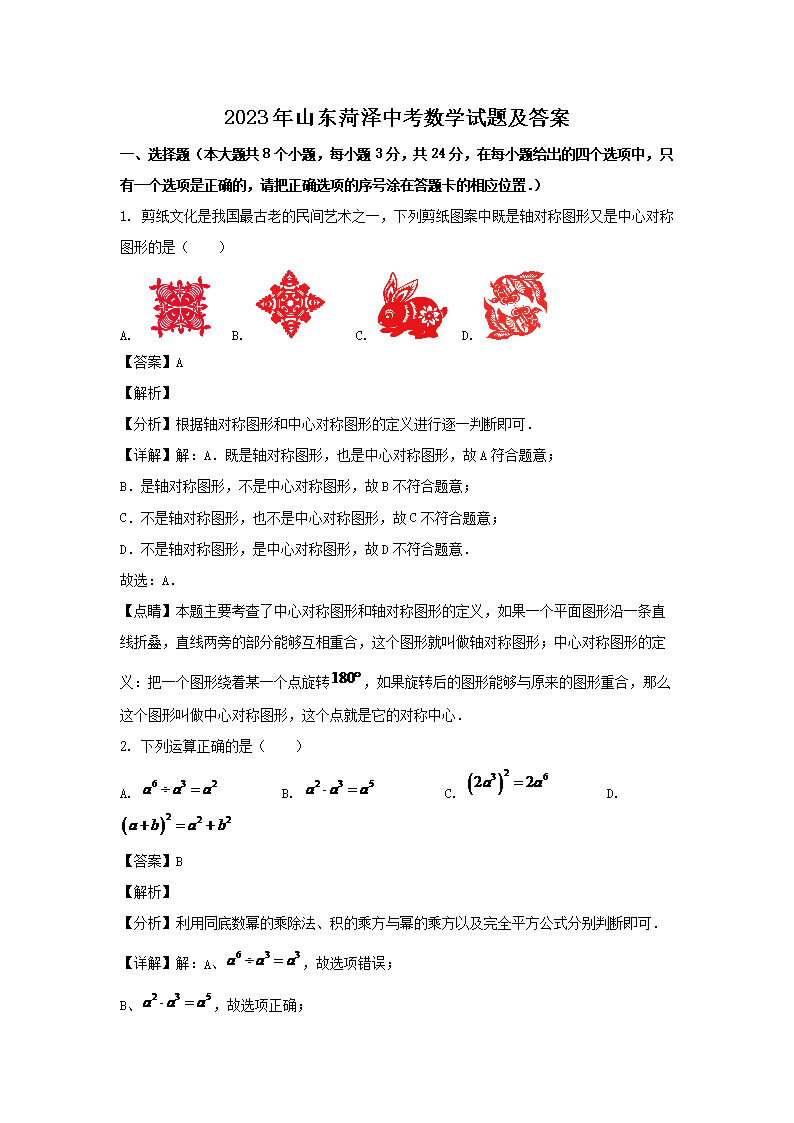 2023年山东菏泽中考数学试题及答案(Word版)07-01