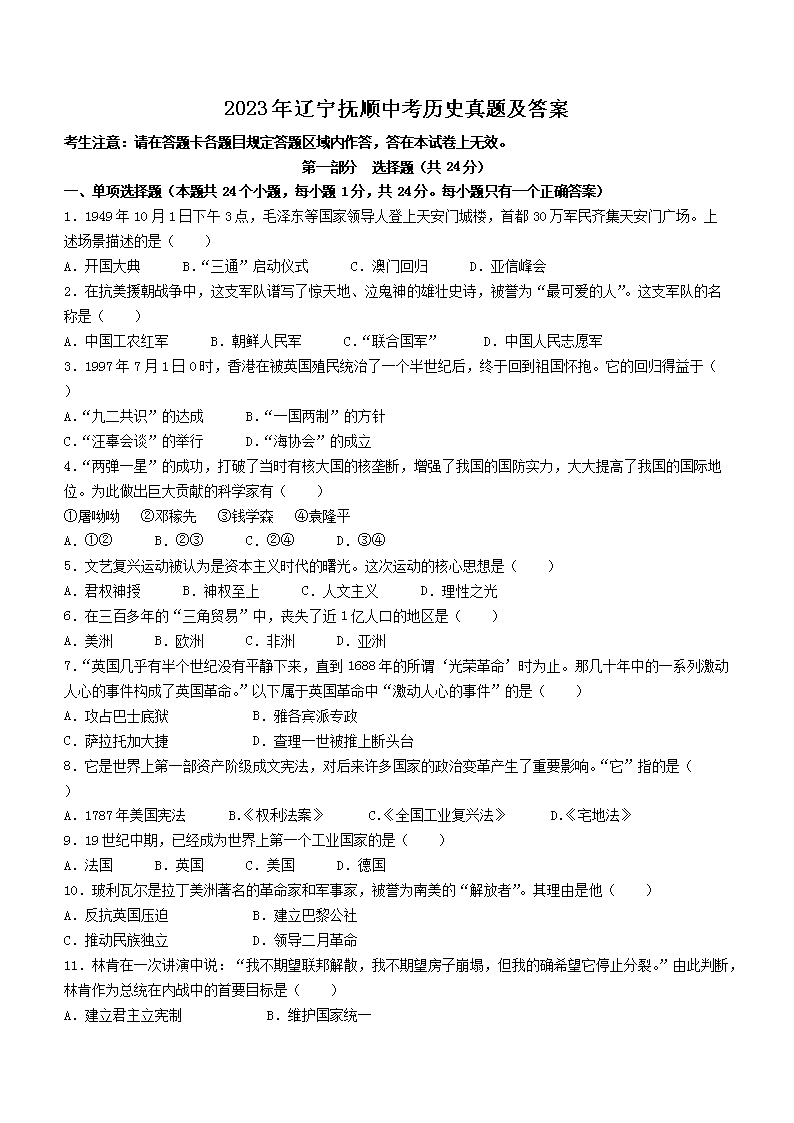 【文档预览】 文档大全网整理发布2023年辽宁抚顺中考历史真题及答案(Word版),前五页预览如下: