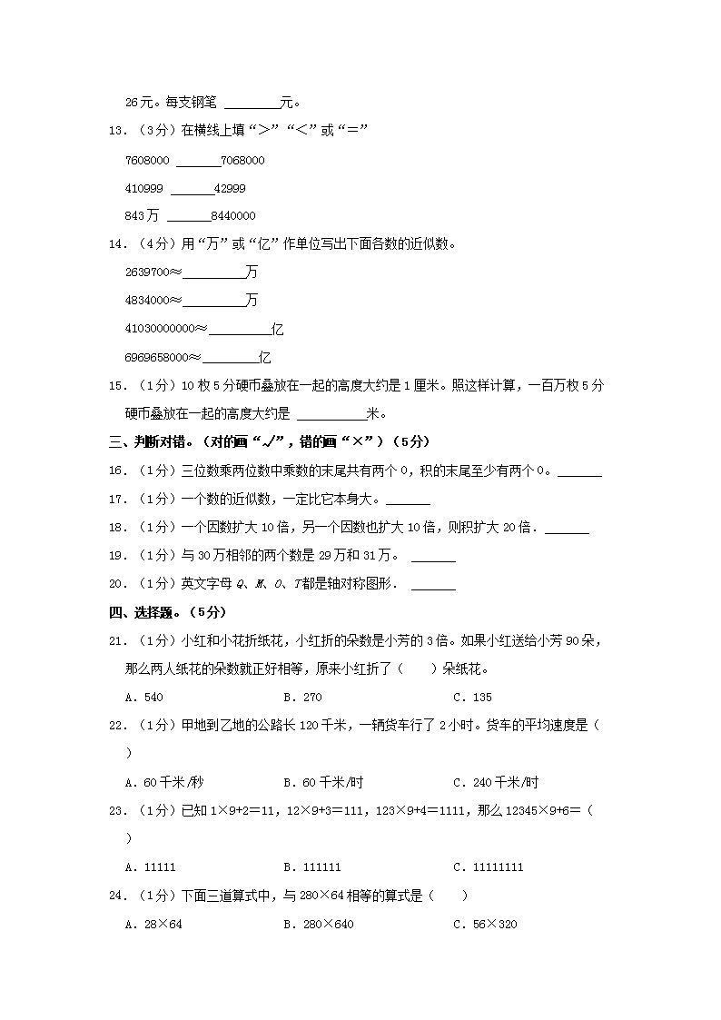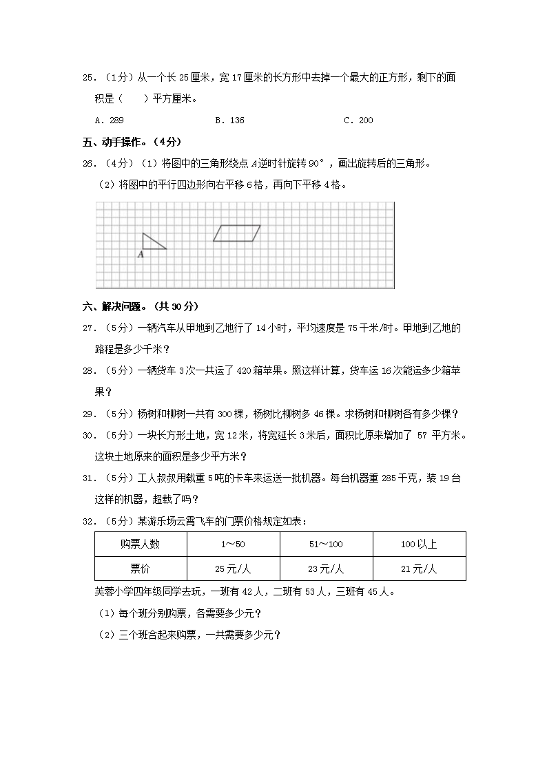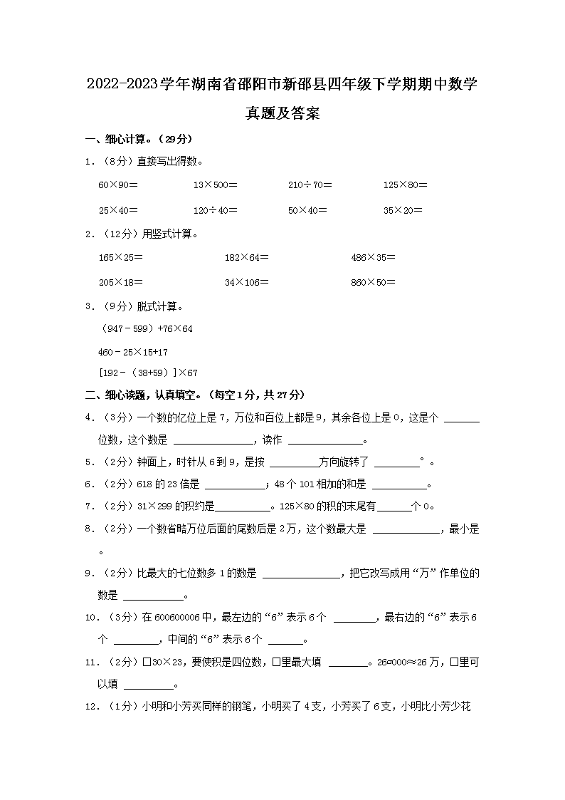 2022-2023学年湖南省邵阳市新邵县四年级下学期期中数学真题及答案(Word版)10-13