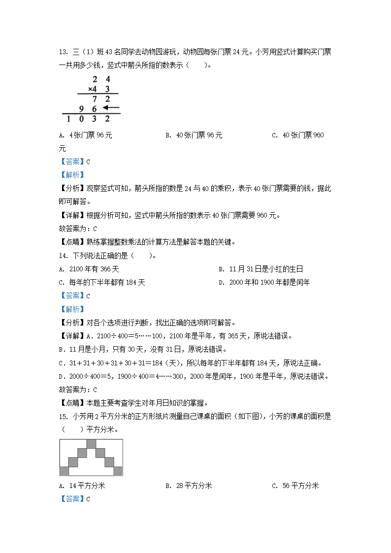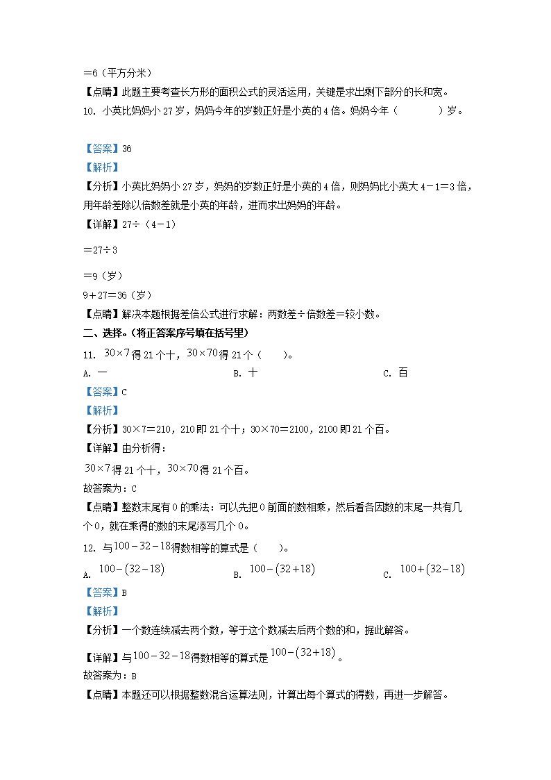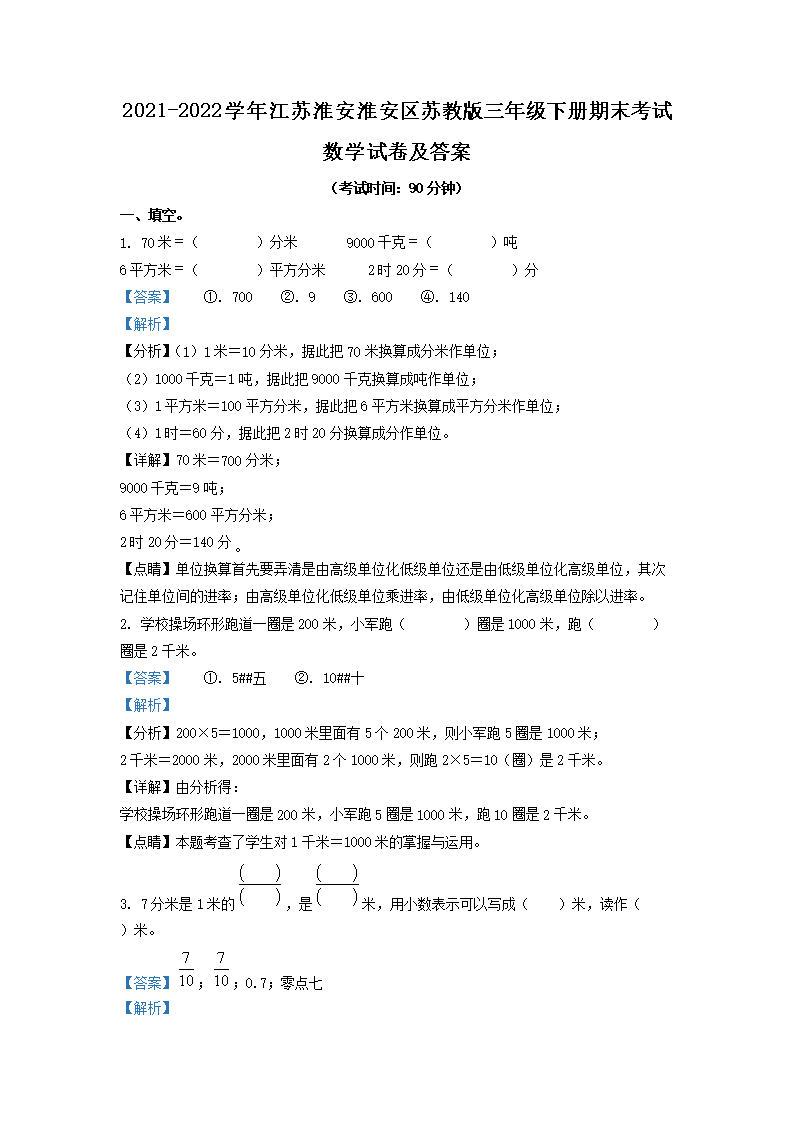 2021-2022学年江苏淮安淮安区苏教版三年级下册期末考试数学试卷及答案(Word版)07-07