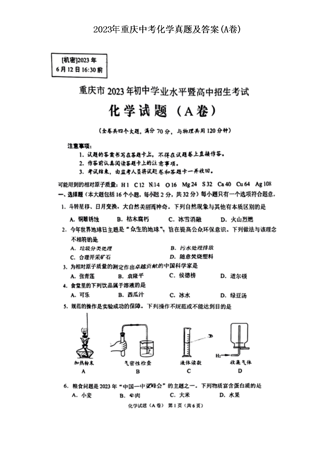 2023年重庆中考化学真题及答案(A卷)(图片版)06-17