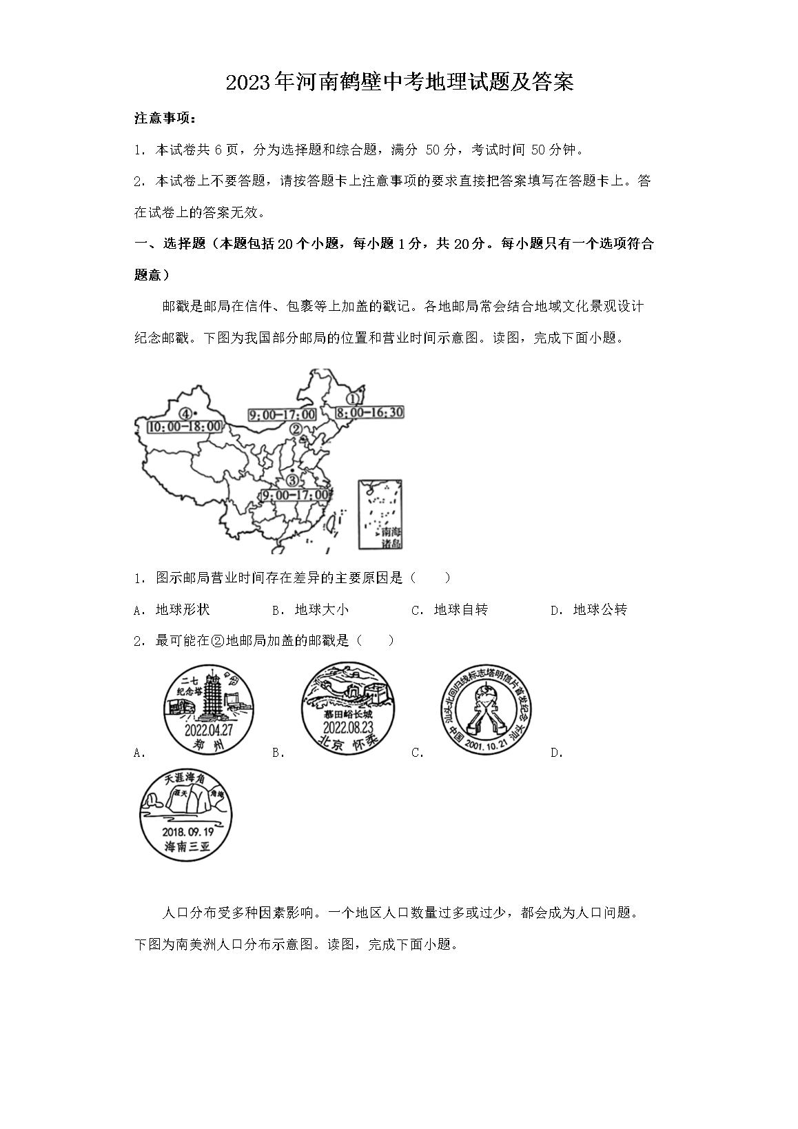 2023年河南鹤壁中考地理试题及答案(Word版)07-18