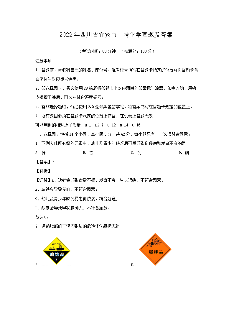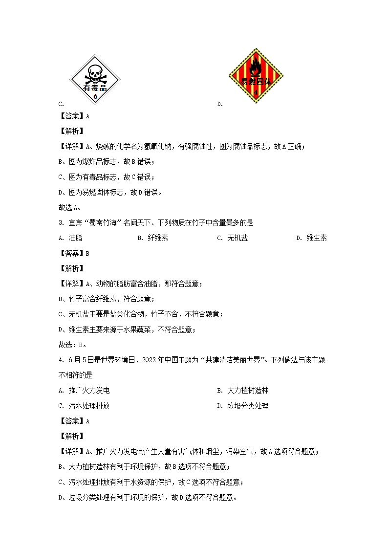 2022年四川省宜宾市中考化学真题及答案(Word版)05-31