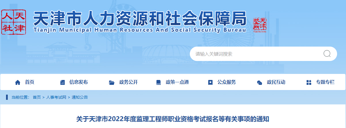 【#监理师考试# 导语】©文档大全网从天津市人力资源和社会保障局了解到,《2022年天津监理工程师职业资格考试考务工作通知》现已发布,2022年天津监理工程师报名时间:3月21日-28日,考试时间:5月14日-15日,©文档大全网小编现将报考信息发布如下: