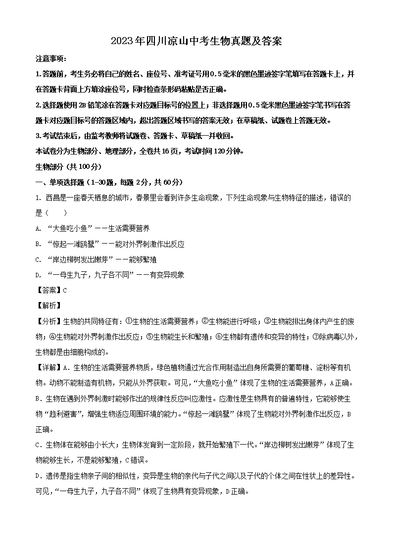 2023年四川凉山中考生物真题及答案(Word版)06-26
