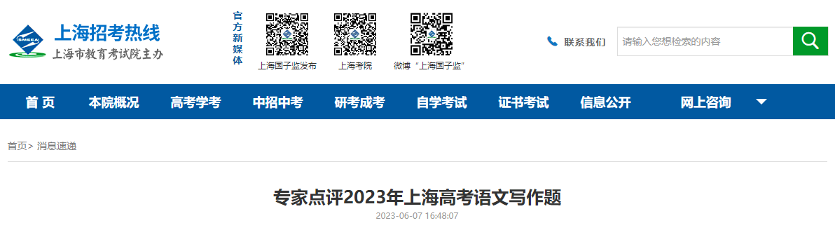 6月7日上午,2023年上海市普通高等学校招生全国统一文化考试(简称“秋考”)语文科目考试结束后,市教育考试院第一时间公布了2023年上海市秋考作文题目: