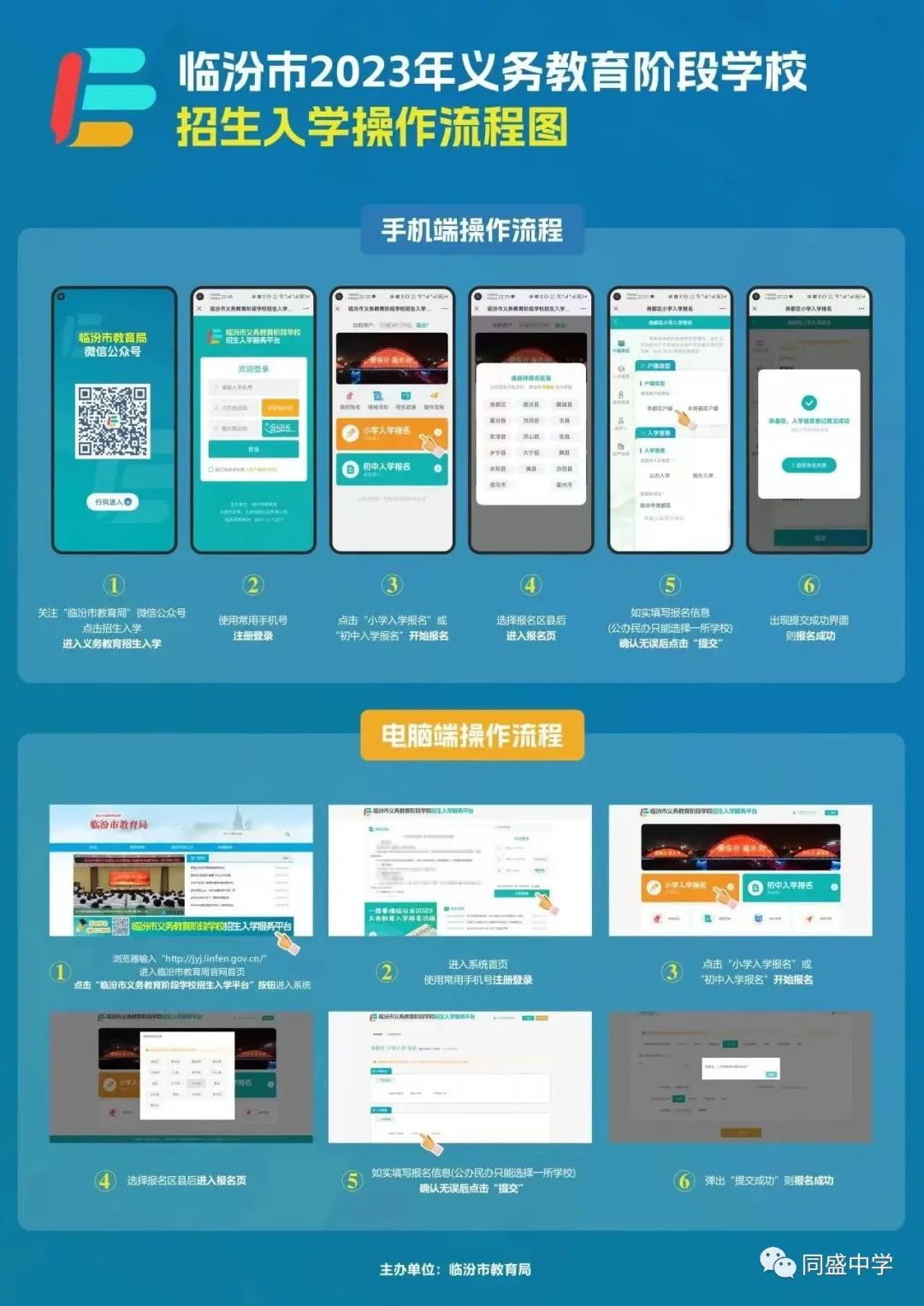 关注“临汾市教育局”微信公众号,点击“招生入学-义务教育招生入学”,点击进入“临汾市义务教育阶段学校招生入学服务平台”,选民办入学—临汾同盛初级中学入学。