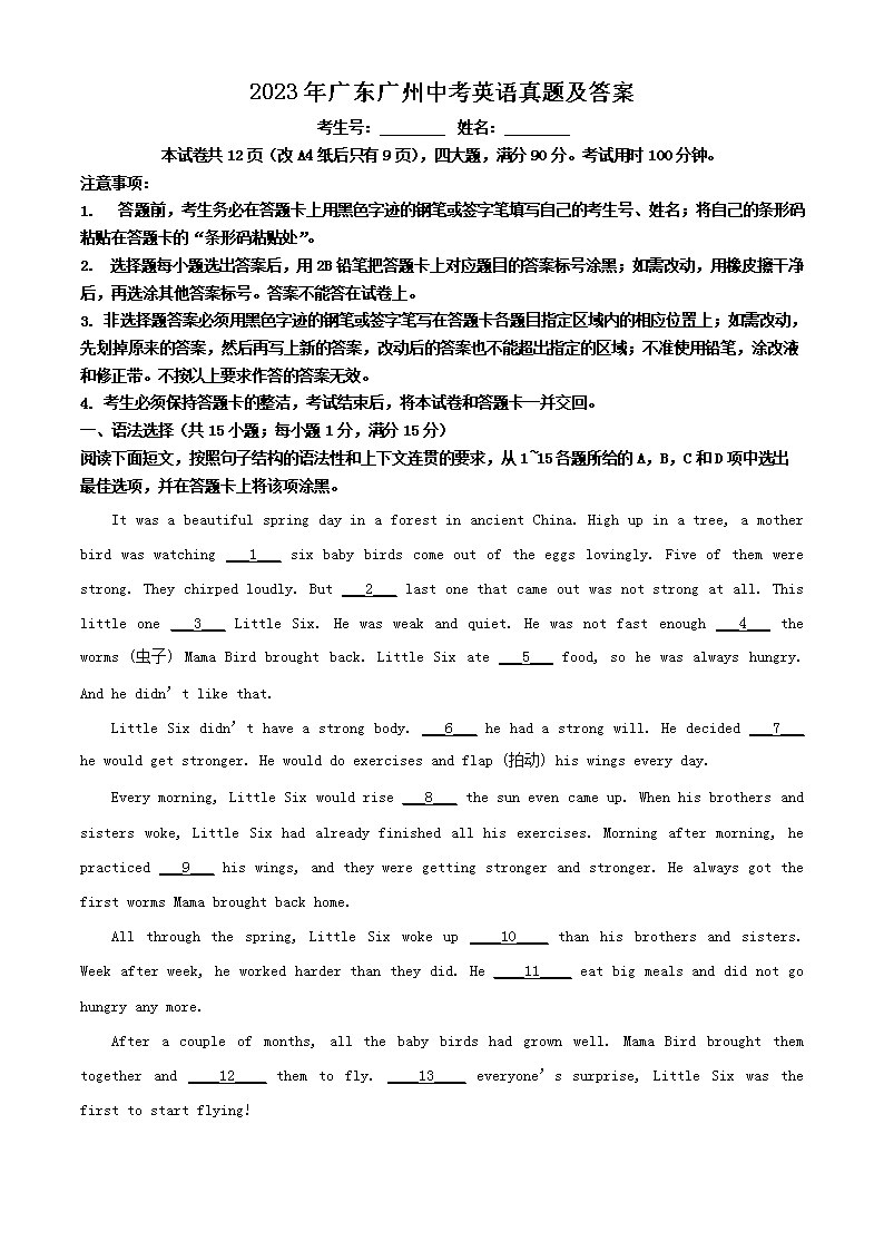 2023年广东广州中考英语真题及答案(Word版)07-22