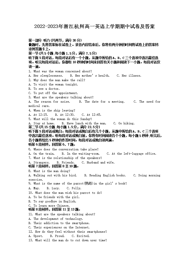 2022-2023年浙江杭州高一英语上学期期中试卷及答案(Word版)09-28