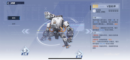 V型机甲拥有持续攻击的能力,他的机枪是火属性攻击,遇到弱火的怪物时有着奇效,高频率的射击与不俗的火属性伤害很容易让弱火怪招架不住,随着星级的提升免控,获得新技能增加输出能力,v型机甲虽然强大但是只针对弱火怪物,并且机甲行动缓慢,需要在安全的距离与环境下使用。