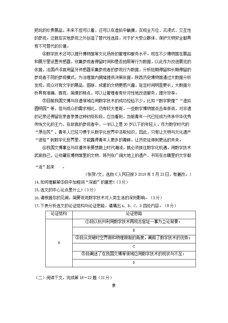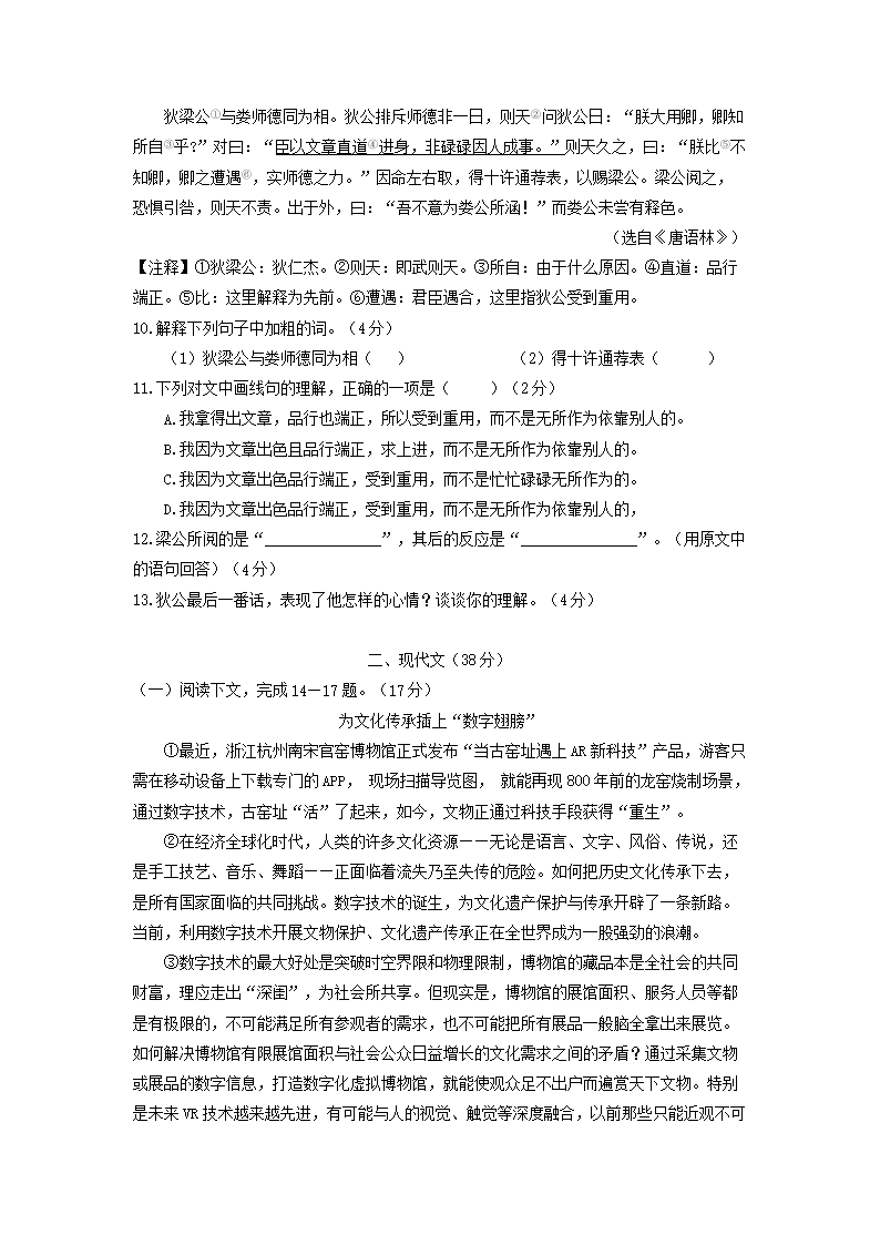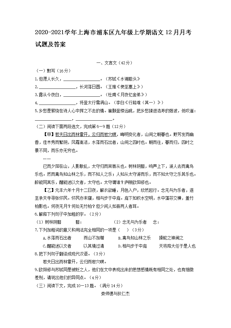 2020-2021学年上海市浦东区九年级上学期语文12月月考试题及答案(Word版)10-20