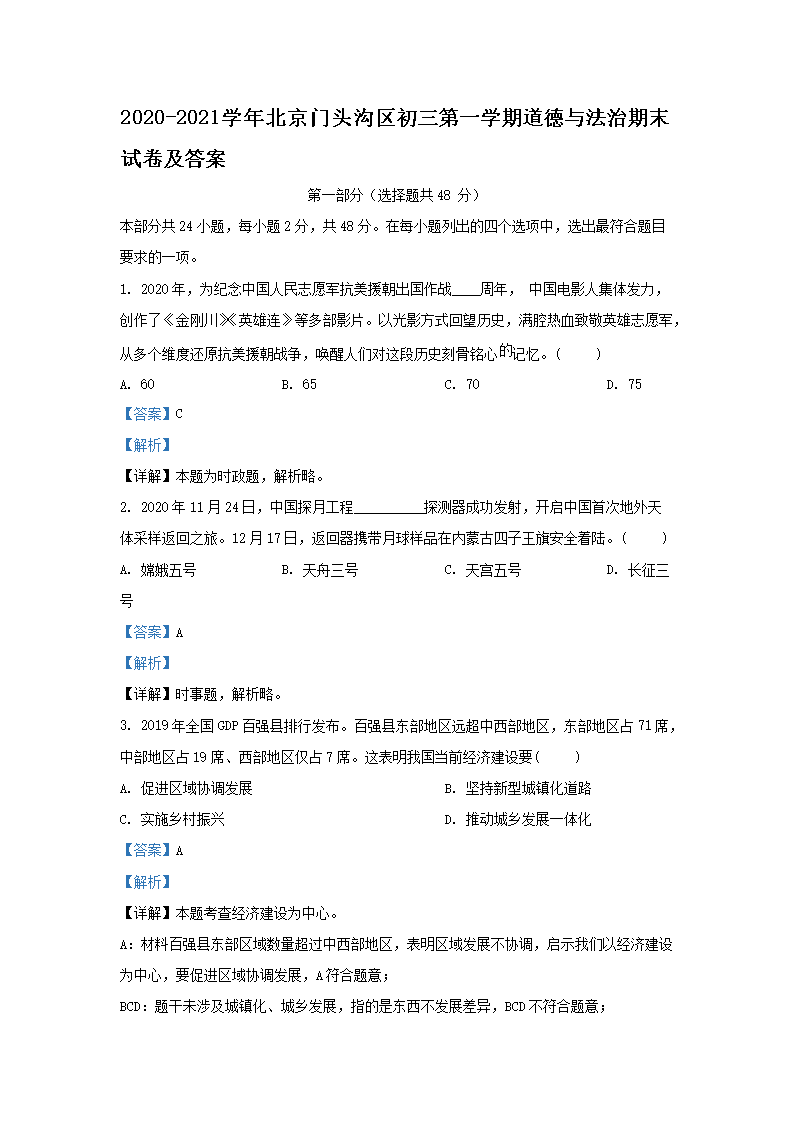 【文档预览】 文档大全网整理发布2020-2021学年北京门头沟区初三第一学期道德与法治期末试卷及答案(Word版),前五页预览如下:
