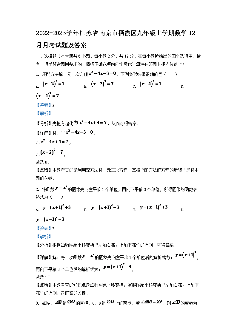 2022-2023学年江苏省南京市栖霞区九年级上学期数学12月月考试题及答案(Word版)09-23