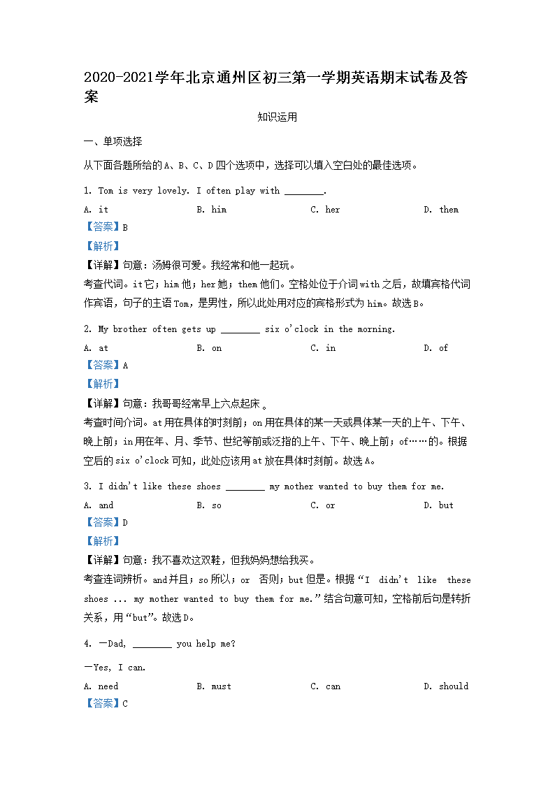 【文档预览】 文档大全网整理发布2020-2021学年北京通州区初三第一学期英语期末试卷及答案(Word版),前五页预览如下: