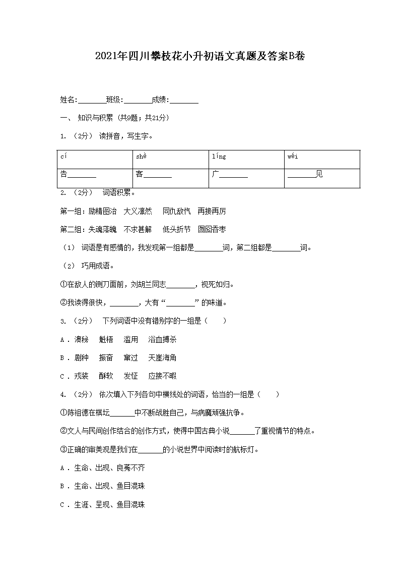 2021年四川攀枝花小升初语文真题及答案B卷(Word版)09-27