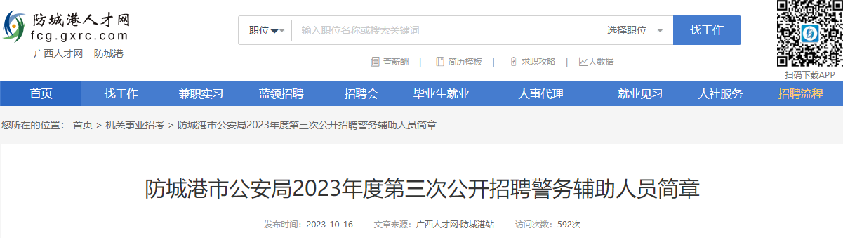报考人员自2023年10月17日起,可通过防城港人才网(http://fcg.gxrc.com/),广西防城港公安局网站(http://gaj.fcgs.gov.cn/)查阅招聘简章及《防城港市公安局2023年度第三次公开招聘警务辅助人员计划表》(附件1)等相关招聘信息。