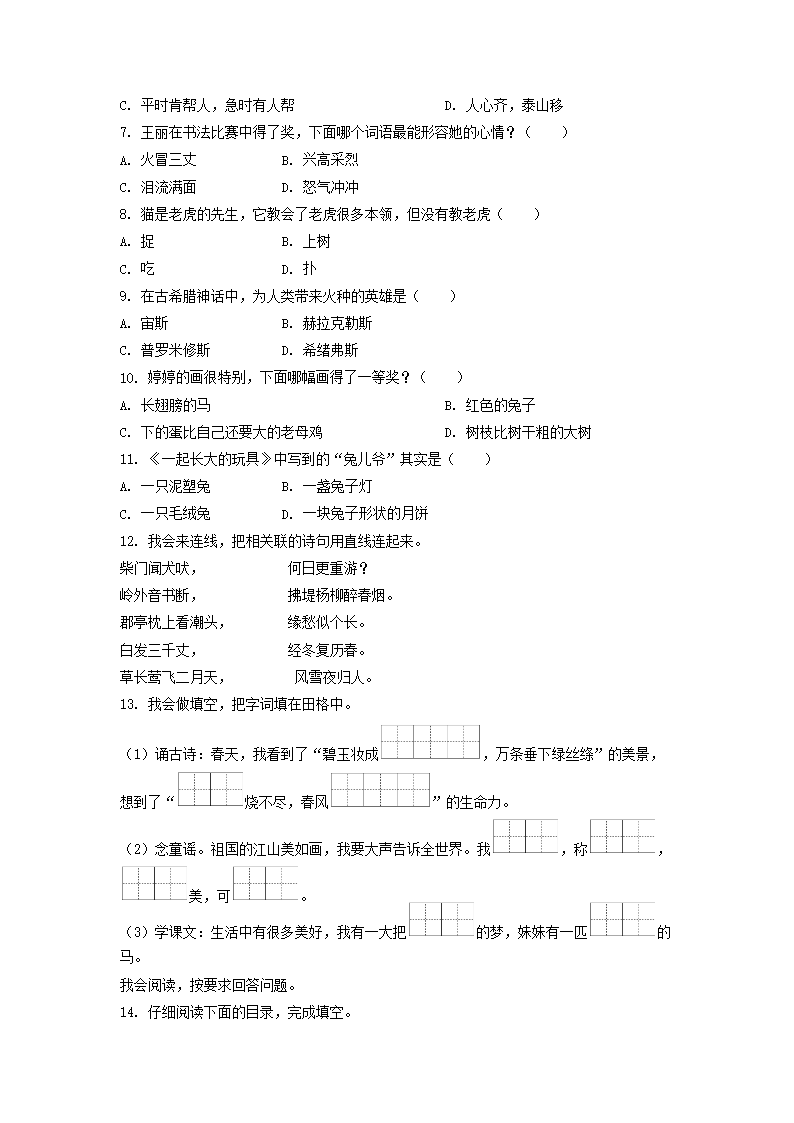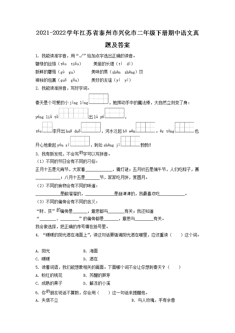 2021-2022学年江苏省泰州市兴化市二年级下册期中语文真题及答案(Word版)06-30