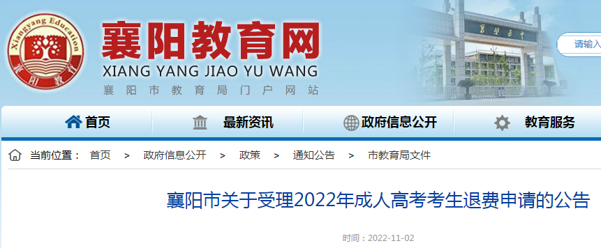 原文标题:襄阳市关于受理2022年成人高考考生退费申请的公告