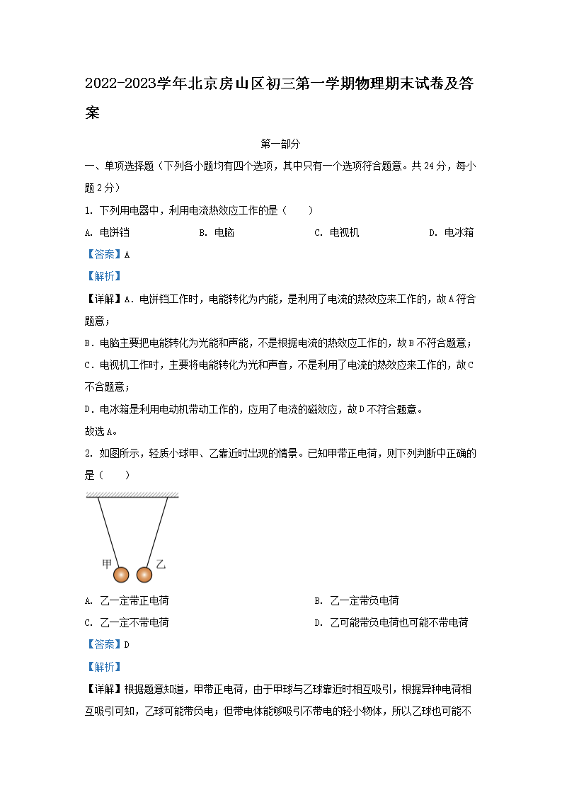2022-2023学年北京房山区初三第一学期物理期末试卷及答案(Word版)08-05