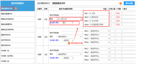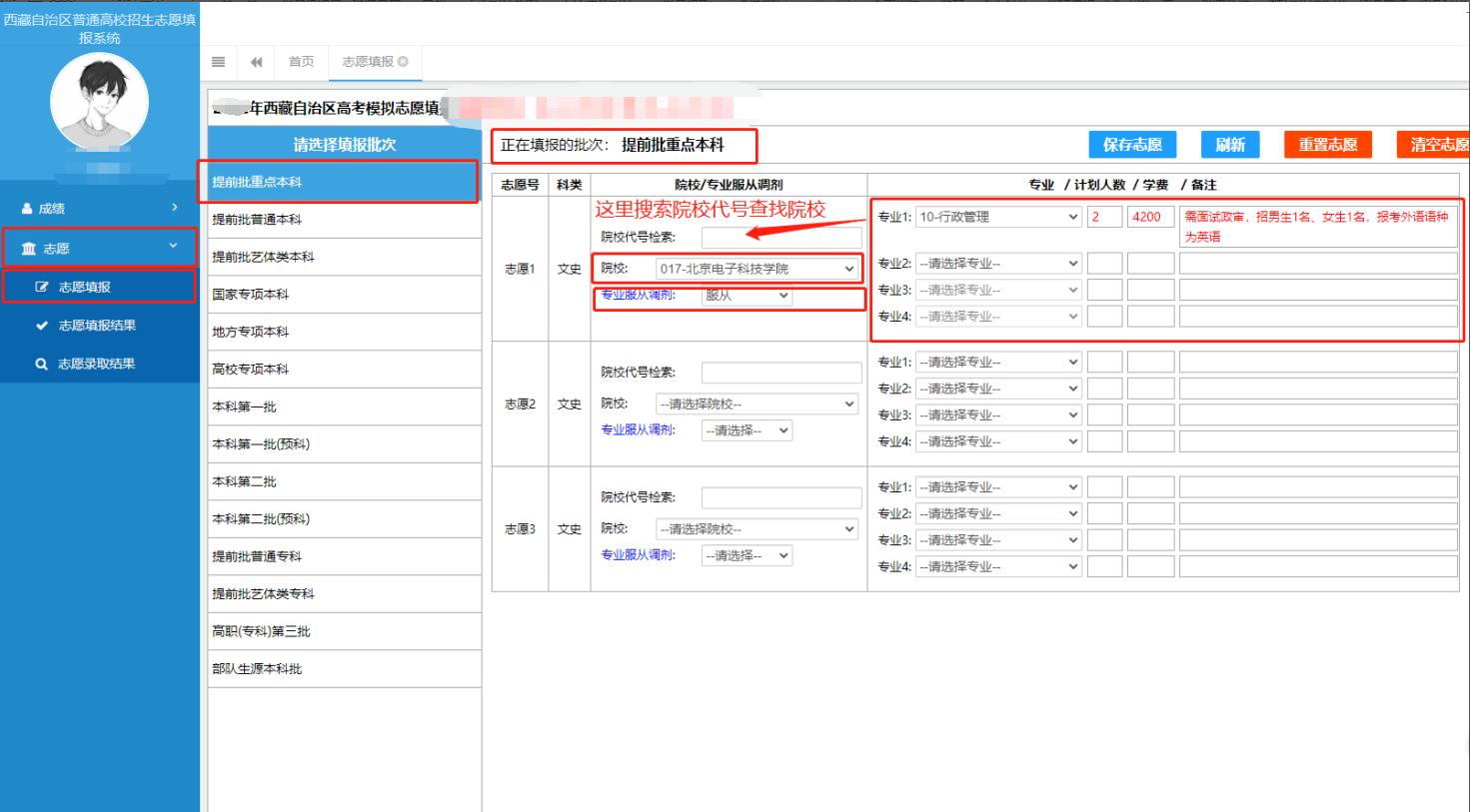 在志愿填报界面,左侧列表点击“志愿”、“志愿填报”,依次选择正在填报批次的院校(可检索)、专业和是否“专业服从调剂”,当前批次所有志愿填报完成后,点击“保存志愿”、“确定”,确定保存【****】志愿。系统弹出【****】志愿保存成功,即完成当前批次志愿填报。须填报一个批次保存一个批次,所有批次志愿一次性填报。