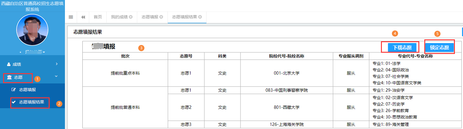 保存的所填志愿可在左侧列表依次点击“志愿”、“志愿填报结果”查看。核对无误且不再修改,须下载志愿表,并锁定志愿。志愿一经锁定,任何人不得修改。如确系填报有误需解锁,考生本人携准考证、身份证到报名地(市)或户籍所在地(市)招生办,提交解锁申请。志愿填报期间最多允许两次解锁。