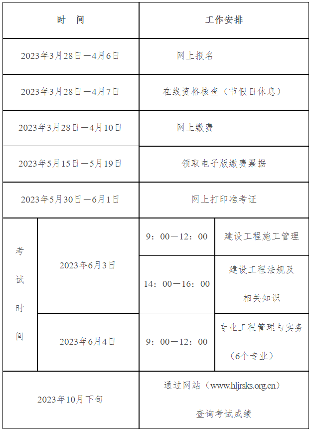 【#二级建造师# 导语】©文档大全网从黑龙江省人事考试网获悉,《2023年黑龙江二级建造师执业资格考试报名工作通告》现已发布,报名时间:3月28日-4月6日,考试时间:6月3日-4日,更多事宜请参考阅读《考务通知》,官方公告原文如下:
