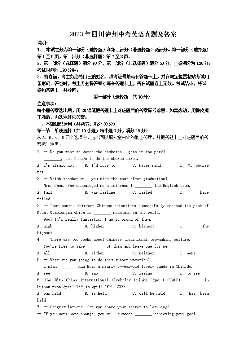 2023年四川泸州中考英语真题及答案(Word版)06-15