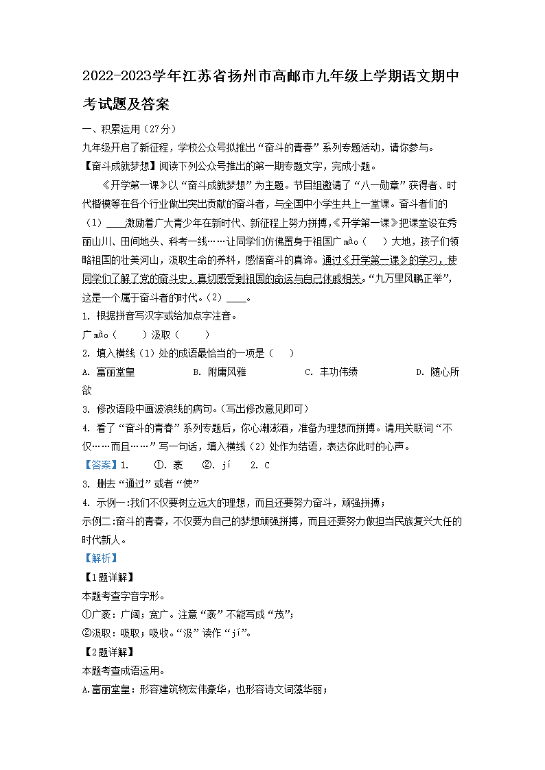2022-2023学年江苏省扬州市高邮市九年级上学期语文期中考试题及答案(Word版)09-13