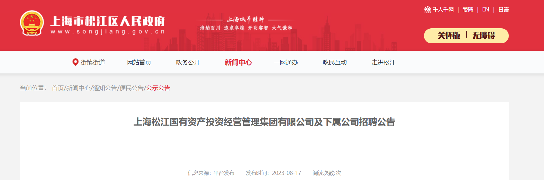 2023年上海松江国有资产投资经营管理集团有限公司及下属公司招聘公告08-18