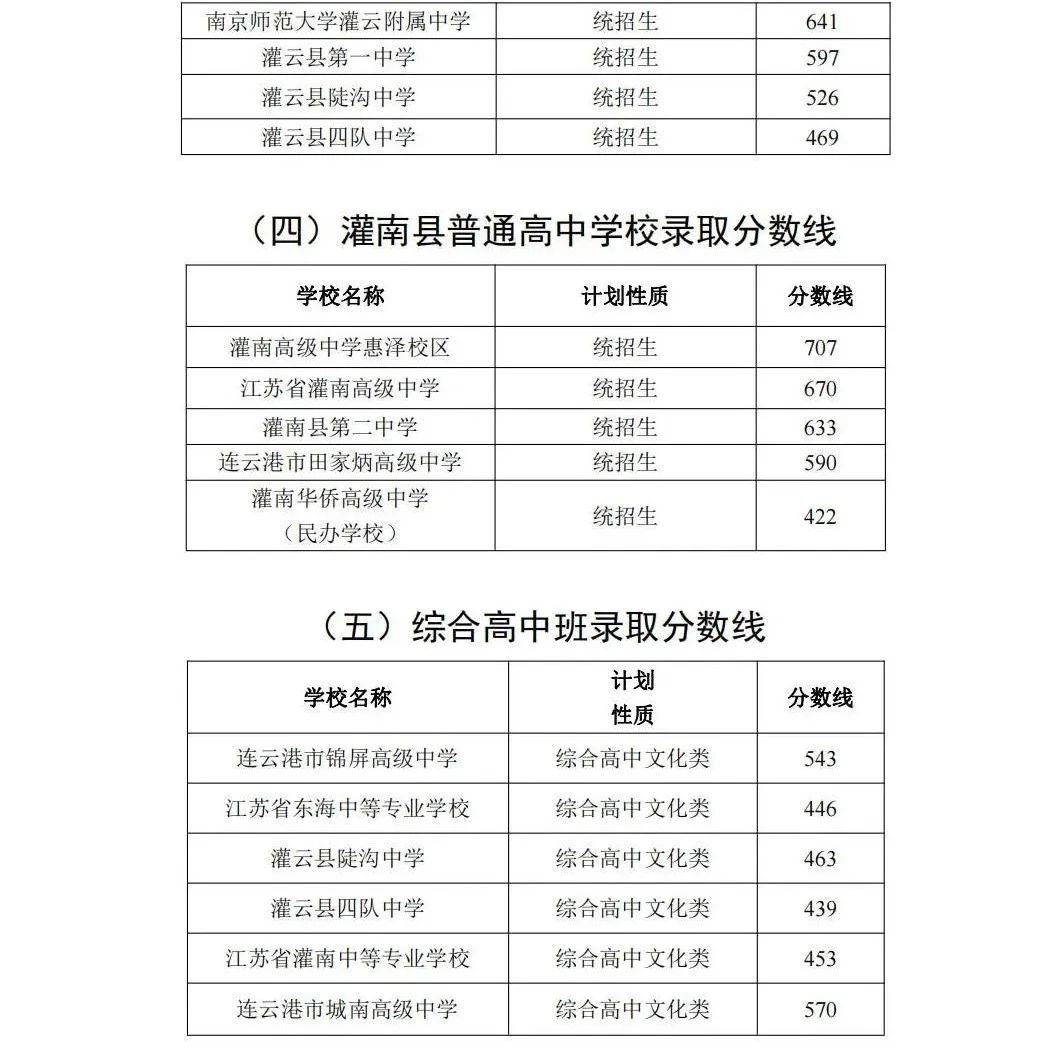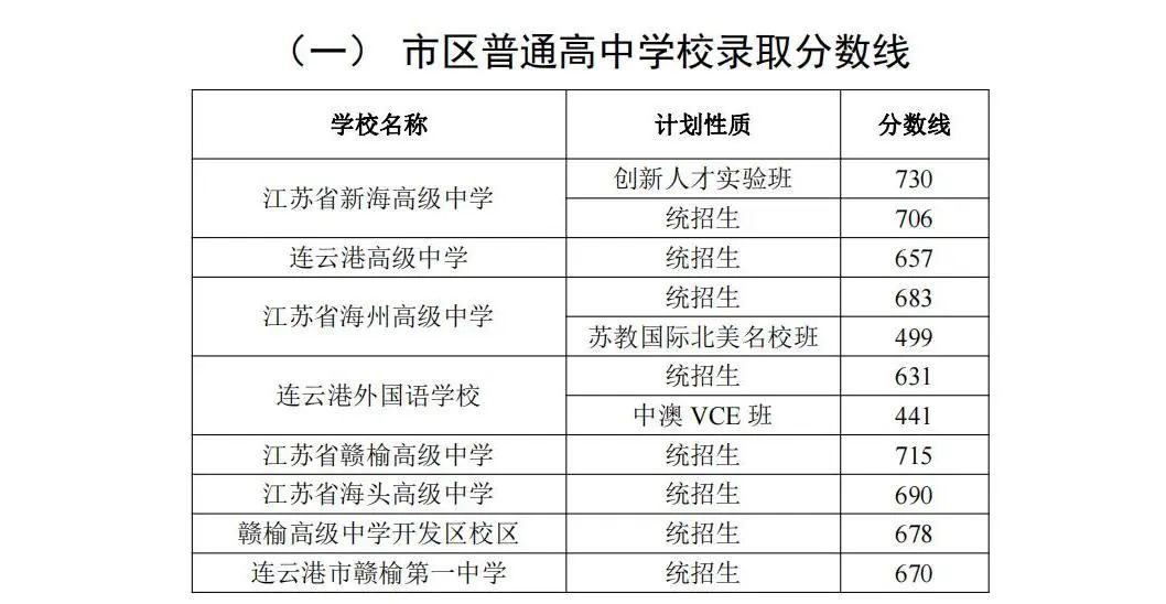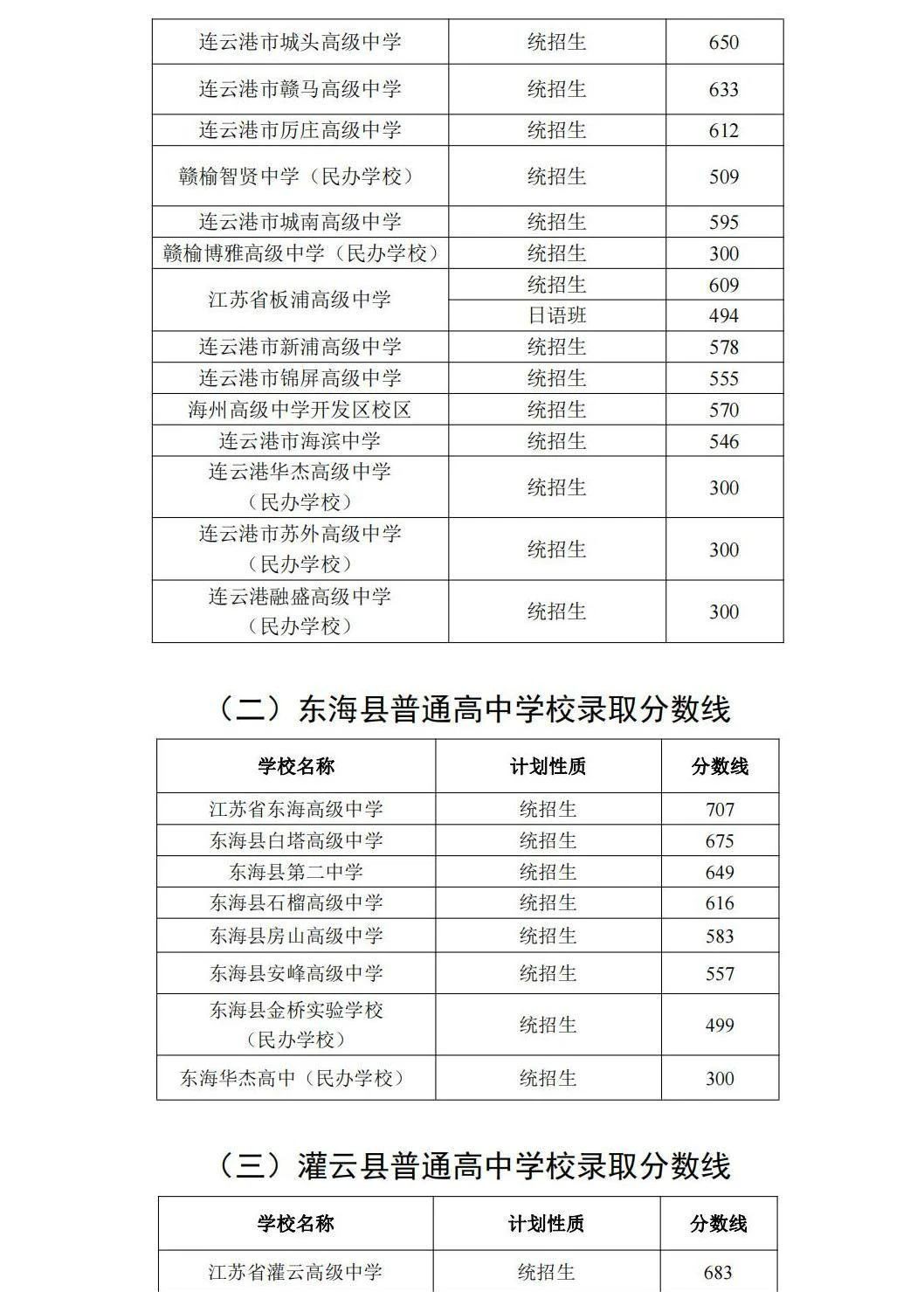 2023年江苏连云港面向全市招生的高中段学校录取分数线公布07-18