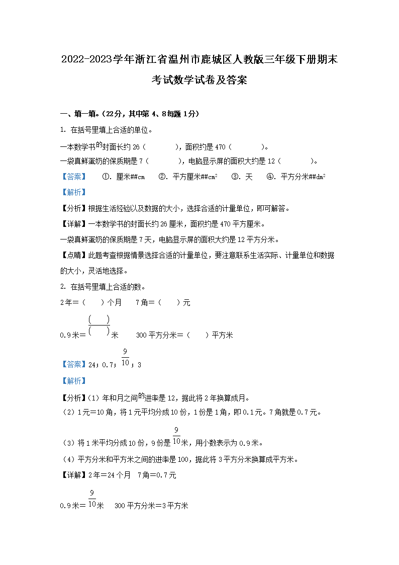 2022-2023学年浙江省温州市鹿城区人教版三年级下册期末考试数学试卷及答案(Word版)09-01