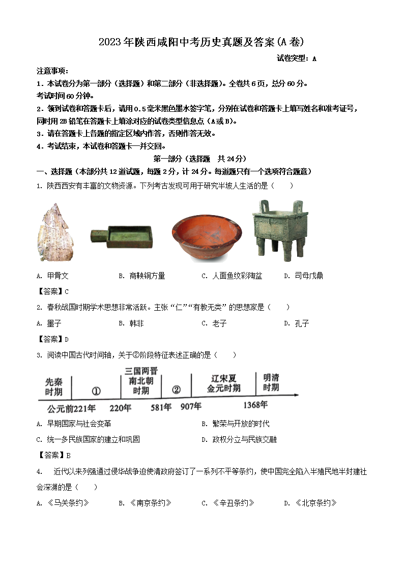 2023年陕西咸阳中考历史真题及答案(A卷)(Word版)06-22
