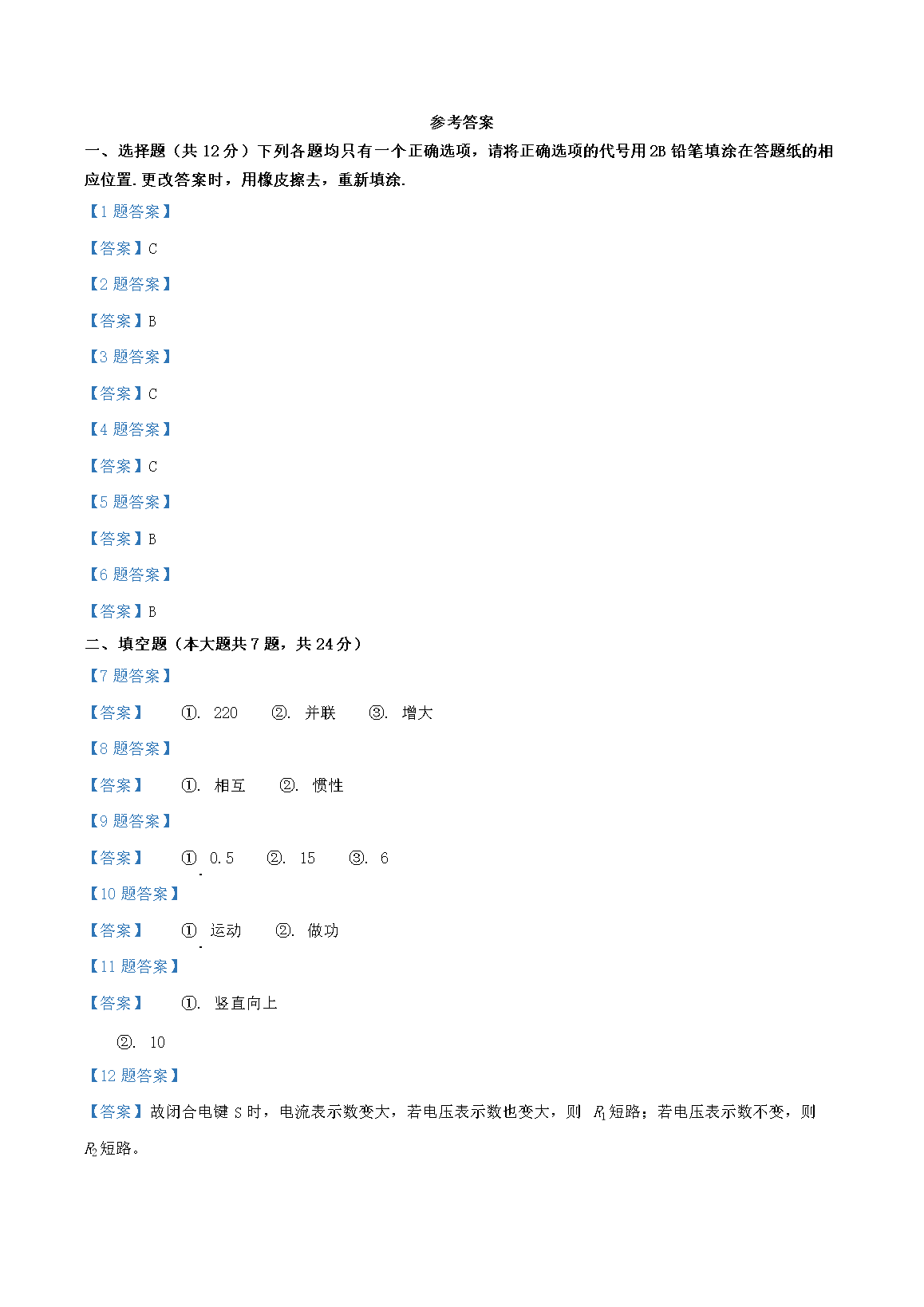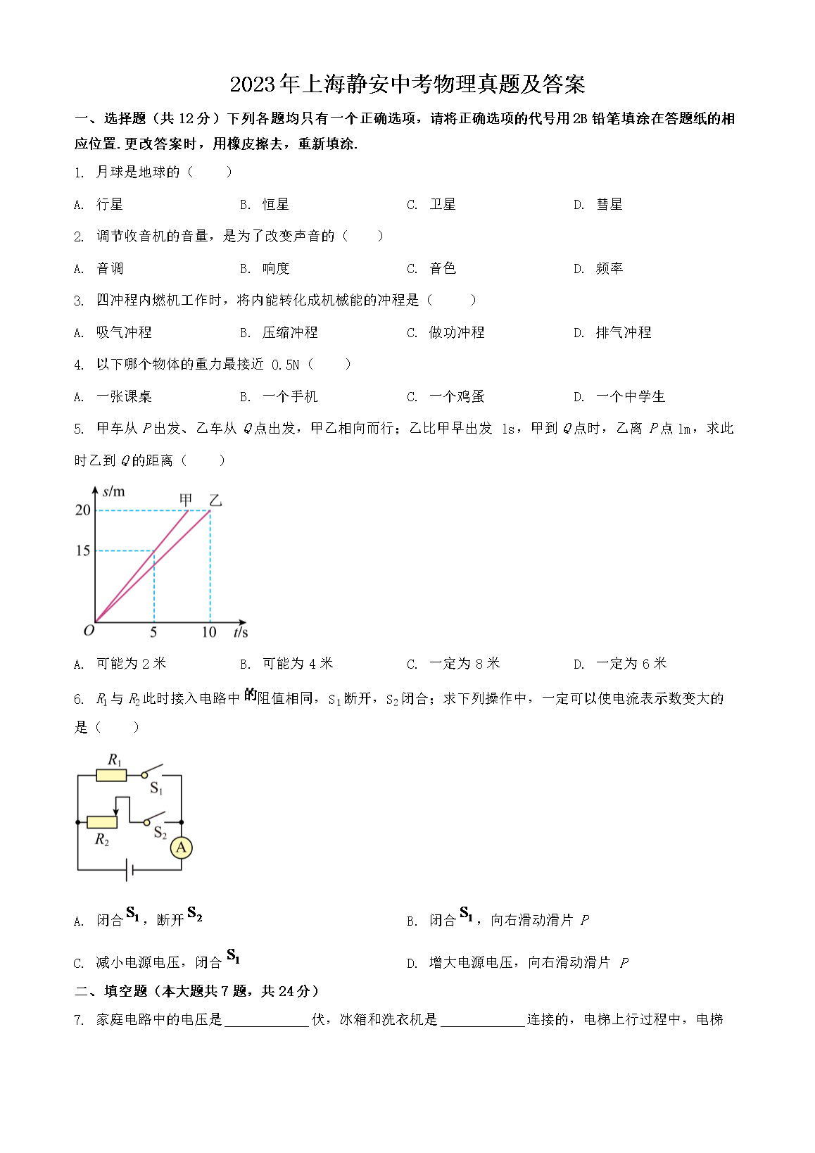 2023年上海静安中考物理真题及答案(Word版)06-23