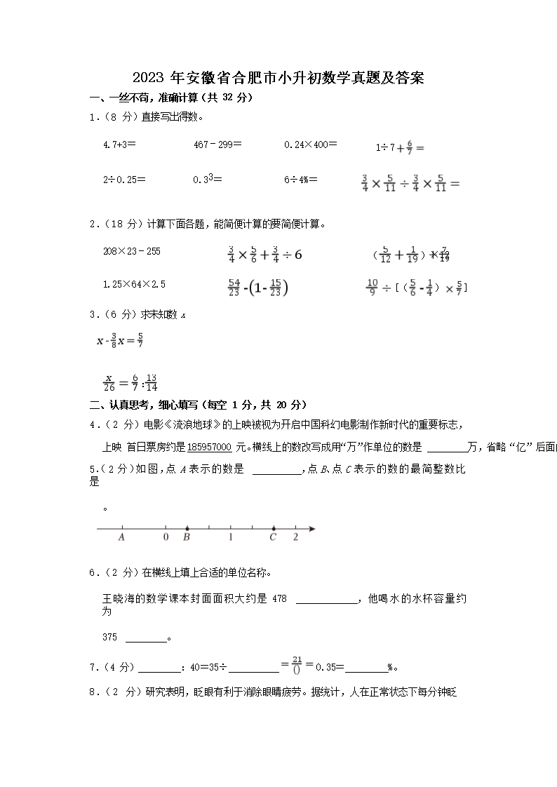 2023年安徽省合肥市小升初数学真题及答案(Word版)09-23