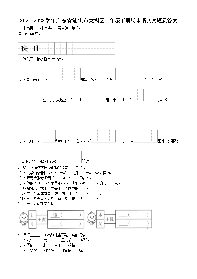 2021-2022学年广东省汕头市龙湖区二年级下册期末语文真题及答案(Word版)08-01