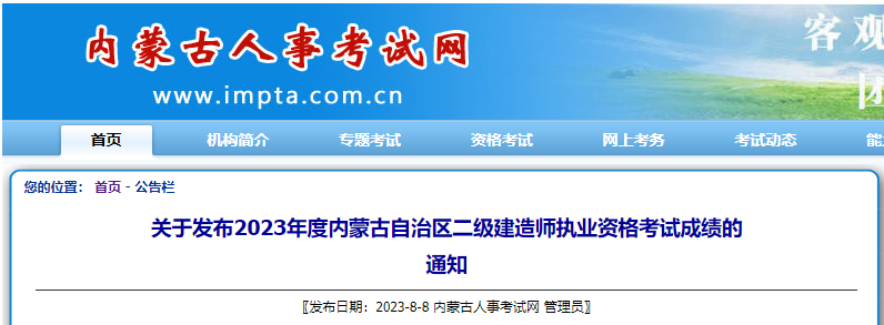 2023年内蒙古二级建造师考试成绩查询时间:8月8日起,报考人员通过“内蒙古人事考试网(www.impta.com.cn)”查询考试成绩!
