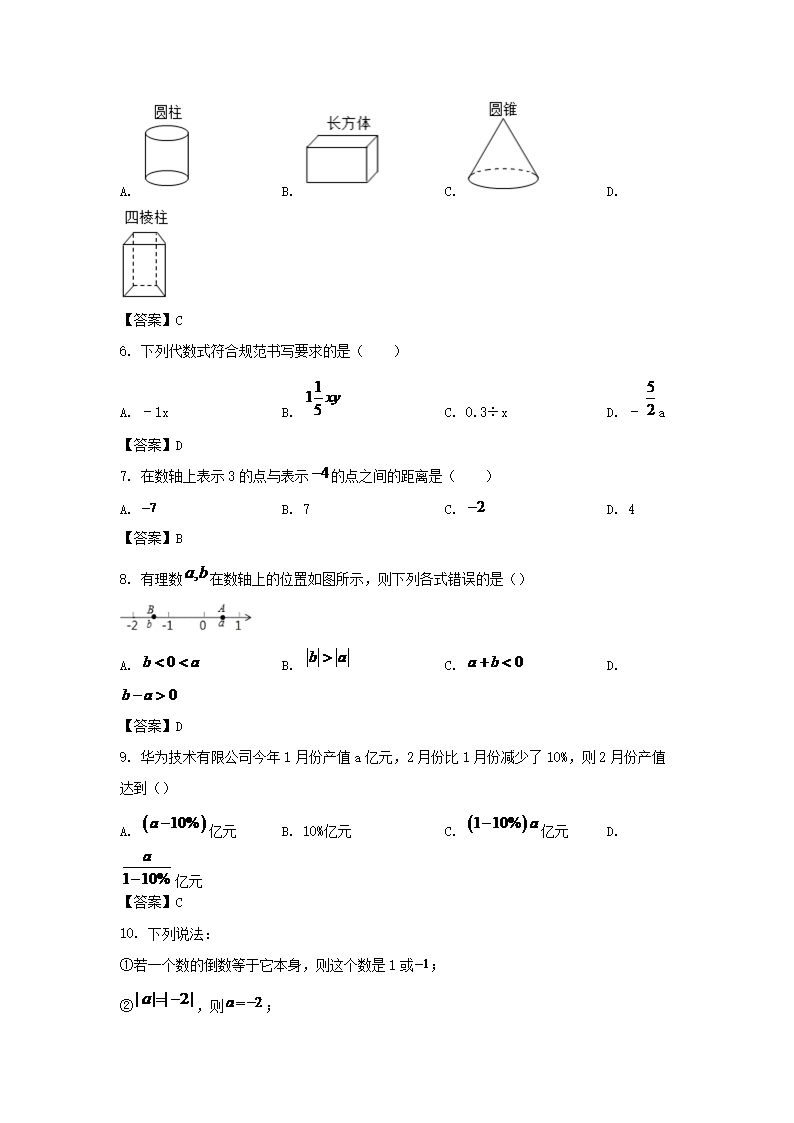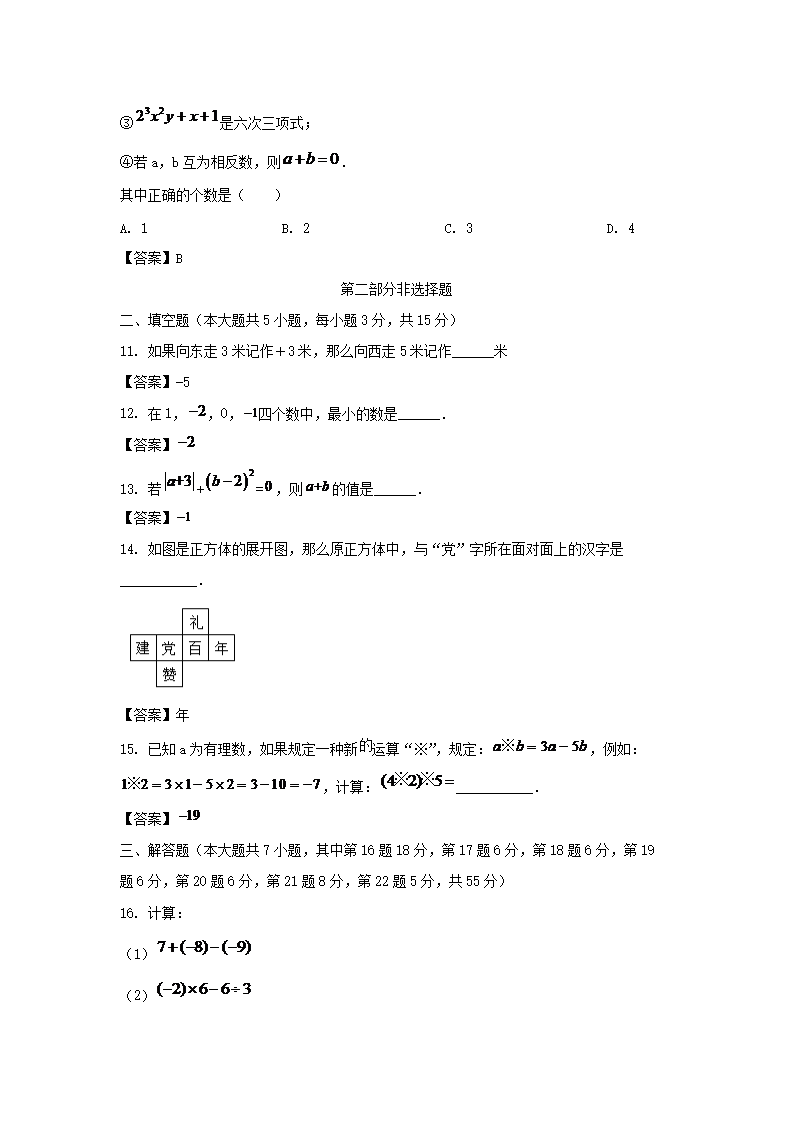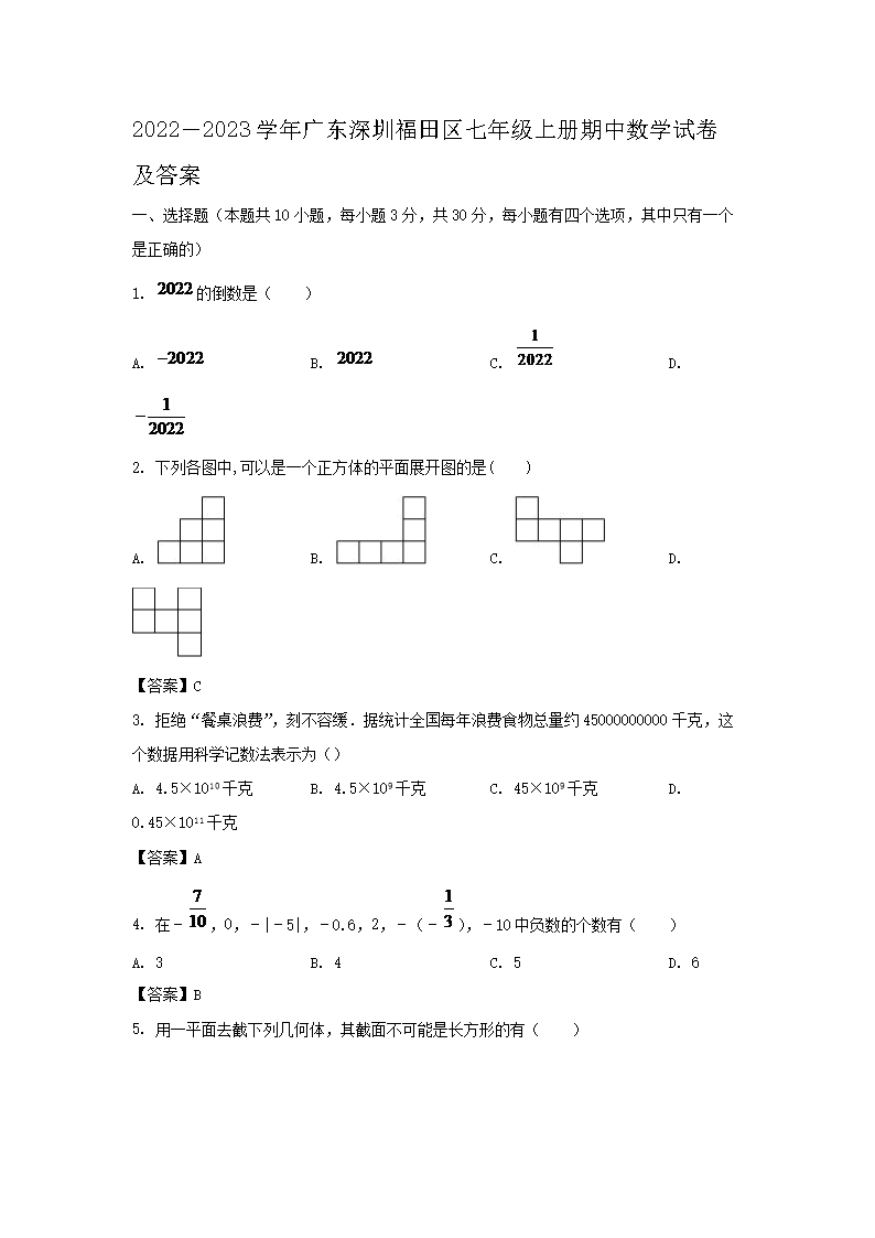 2022-2023学年广东深圳福田区七年级上册期中数学试卷及答案(Word版)09-23