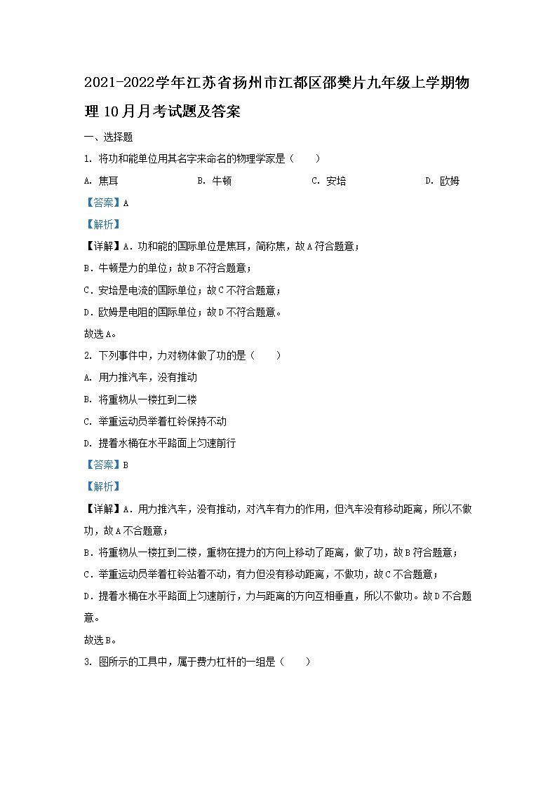 【文档预览】 文档大全网整理发布2021-2022学年江苏省扬州市江都区邵樊片九年级上学期物理10月月考试题及答案(Word版),前五页预览如下: