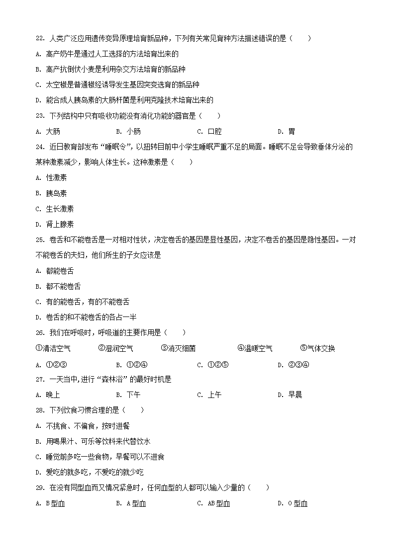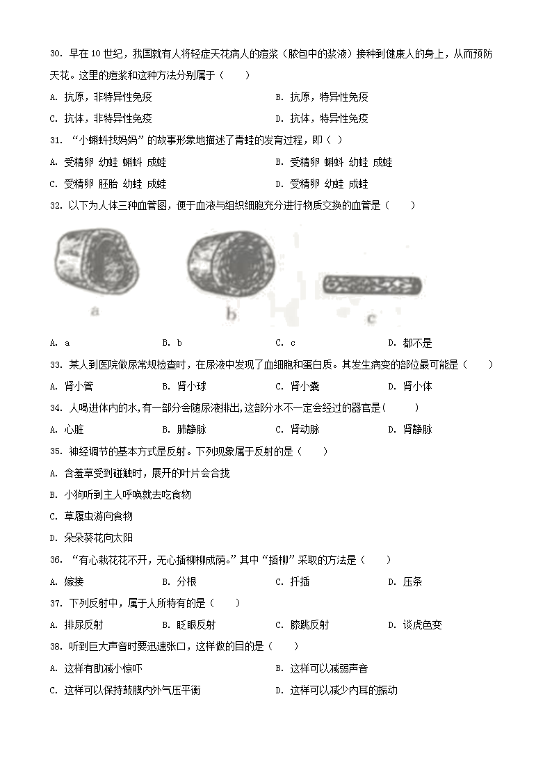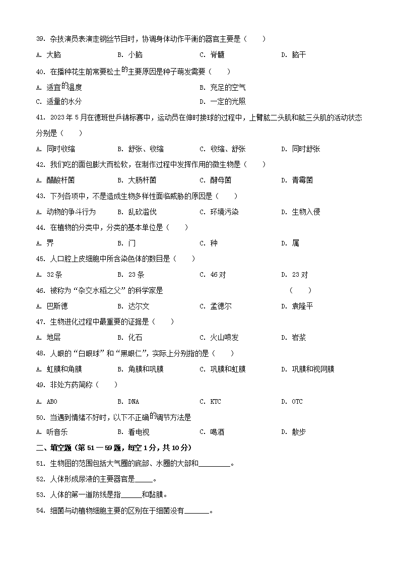 2023年黑龙江双鸭山中考生物真题及答案(Word版)06-30