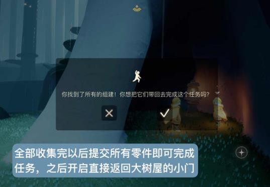 6、全部收集完后点击勾勾,返回大树屋去提交任务。 以上就是光遇大树屋第二个任务的完成攻略,该任务的流程还是比较复杂的,不清楚怎么完成的小伙伴可以了解一下。