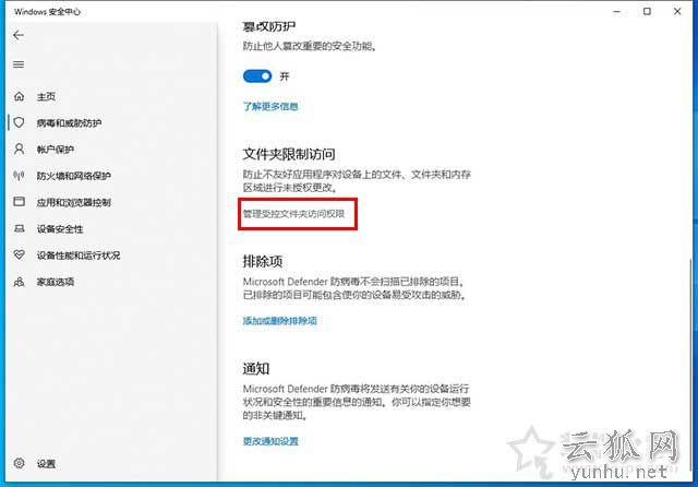 5、下拉至底部找到“文件夹限制访问”下面,点击“管理受控文件夹访问权限”。