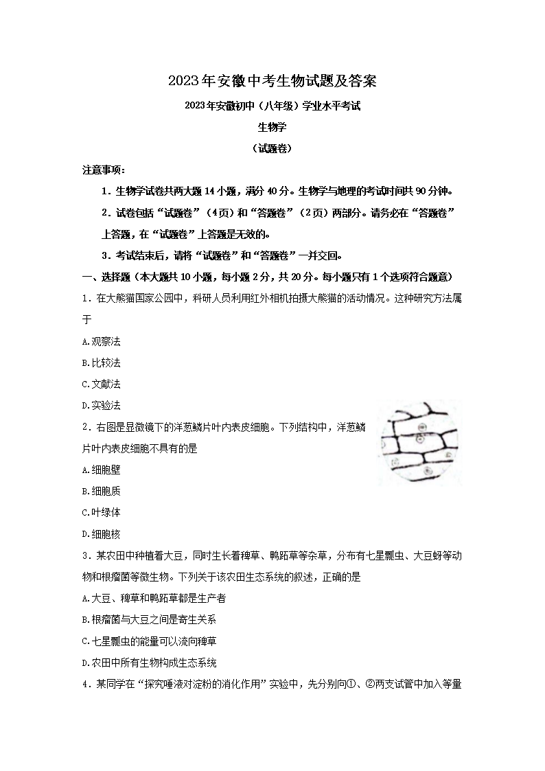 2023年安徽中考生物试题及答案(Word版)06-20