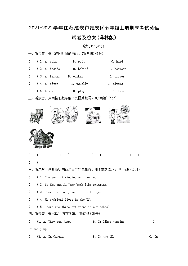 【文档预览】 文档大全网整理发布2021-2022学年江苏淮安市淮安区五年级上册期末考试英语试卷及答案(译林版)(Word版),前五页预览如下: